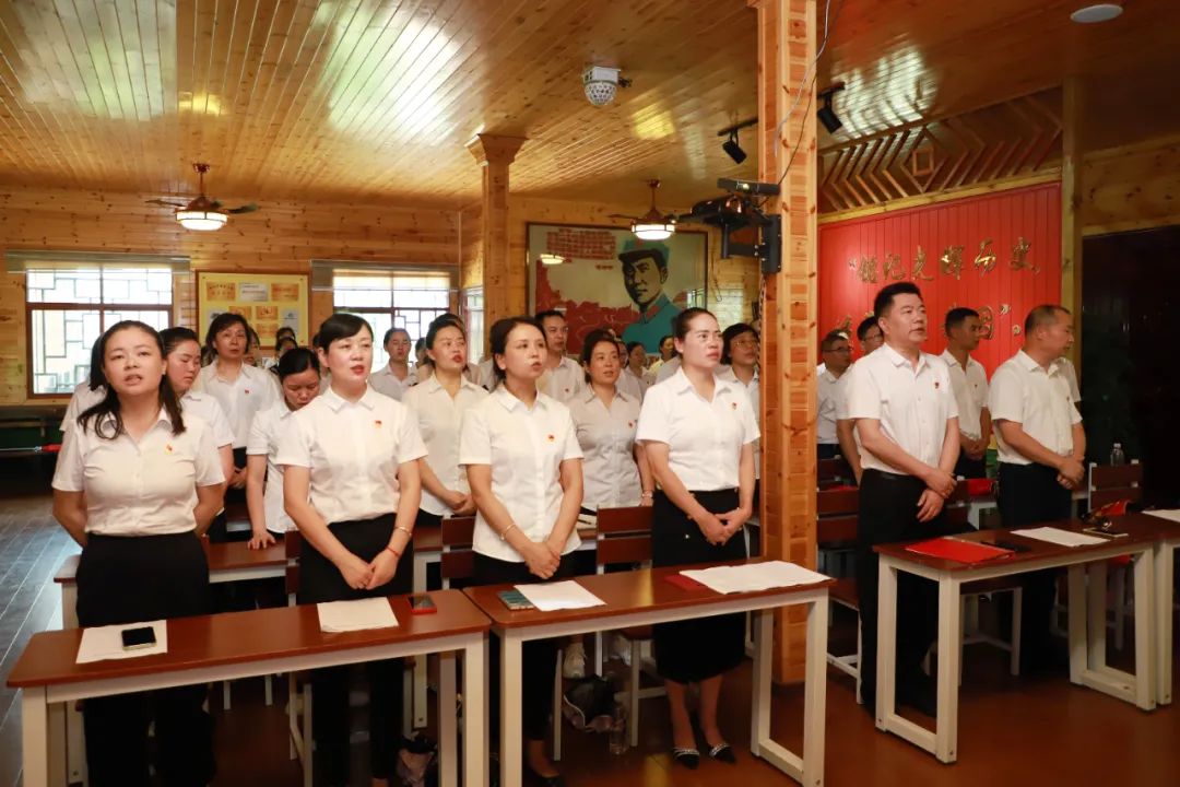 烈士紀(jì)念碑前,懷仁黨員們懷著無比崇敬的心情瞻仰先烈風(fēng)采,傳承紅色精神,汲取奮進(jìn)力量。陳毳萍書記帶領(lǐng)全體黨員面對鮮紅的黨旗高舉右手重溫入黨誓詞,表達(dá)矢志不渝守初心的堅定信念和決心。