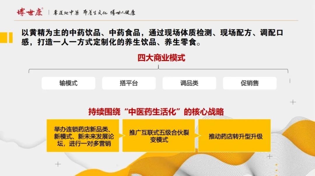 博世康商業(yè)模式可以概括為“輸模式、搭平臺(tái)、調(diào)品類(lèi)、促銷(xiāo)售”的全方位服務(wù)模式,不僅提供傳統(tǒng)的中藥飲片,還針對(duì)市場(chǎng)需求,研發(fā)和推廣中藥生活化品類(lèi)。博世康在藥店提供以黃精為主的中藥飲品、中藥食品,通過(guò)現(xiàn)場(chǎng)體質(zhì)檢測(cè)、現(xiàn)場(chǎng)配方、調(diào)配口感,打造一人一方式定制化的養(yǎng)生飲品、養(yǎng)生零食。未來(lái)3-5年,公司持續(xù)圍繞“中醫(yī)藥生活化”的核心戰(zhàn)略,舉辦連鎖藥店新品類(lèi)、新模式、新未來(lái)發(fā)展論壇進(jìn)行一對(duì)多營(yíng)銷(xiāo),推廣互聯(lián)式五級(jí)合伙裂變模式,推動(dòng)藥店轉(zhuǎn)升型升級(jí)。