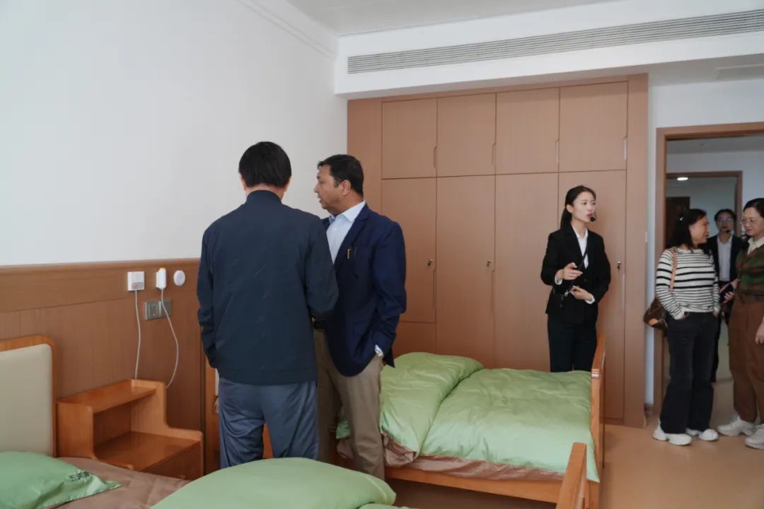 在五調(diào)康養(yǎng)苑,一行人通過建筑模型了解園區(qū)各服務(wù)板塊,同時(shí),Iqbal院士和劉新民教授詳細(xì)考察了房間的適老化設(shè)備、參觀長者活動(dòng)室,并聽取講解員介紹懷仁康養(yǎng)戰(zhàn)略定位——“中國式大中醫(yī)康養(yǎng)引領(lǐng)者”,將秉持“文創(chuàng)品牌先行、教育培訓(xùn)引領(lǐng)、健康管理抓手、產(chǎn)業(yè)綜合支撐”的戰(zhàn)略綱領(lǐng),致力于構(gòu)建一個(gè)集醫(yī)藥、醫(yī)療、醫(yī)養(yǎng)于一體的新型康養(yǎng)綜合體。