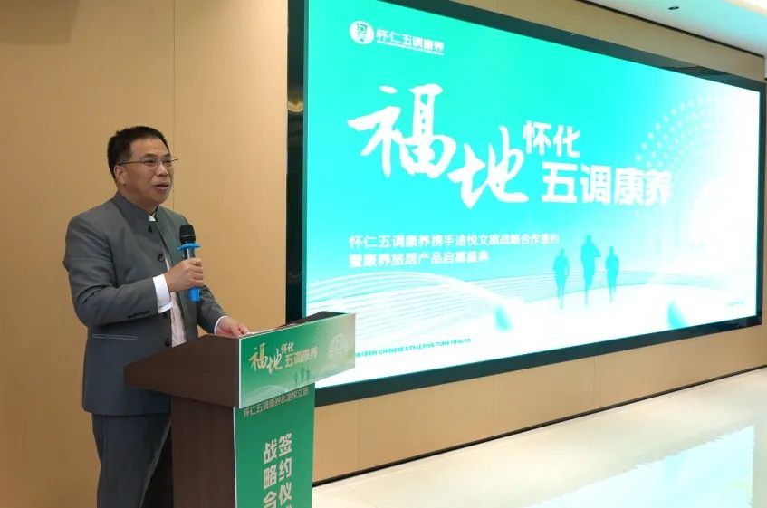 懷仁集團董事長兼總裁林承雄首先上臺致辭,他表示,懷仁以五調(diào)康養(yǎng)園為基點,助力懷化打造成“中國康養(yǎng)之都”。五調(diào)康養(yǎng)園的核心理念是“中國式大中醫(yī)五調(diào)康養(yǎng)”,通過經(jīng)絡、能量、膳食、精神、生活五個方面進行調(diào)理、調(diào)整、調(diào)養(yǎng),幫助入住人群延長生命長度、拓展生命寬度,健康增壽10歲,幸福指數(shù)提升10%。他相信,懷化未來不僅能以“長壽之鄉(xiāng)”聞名,更能以“五調(diào)康養(yǎng)”立標。懷仁與途悅文旅的戰(zhàn)略合作,旨在將雙方資源優(yōu)勢轉(zhuǎn)化為“康養(yǎng)旅居”的獨特 IP,將康養(yǎng)園與懷化周邊旅游資源串聯(lián)起來,構(gòu)建“身心靈”全維度療愈的康養(yǎng)生態(tài)體系,雙方將攜手努力,將懷化建設成為人人向往的“康養(yǎng)之都”。