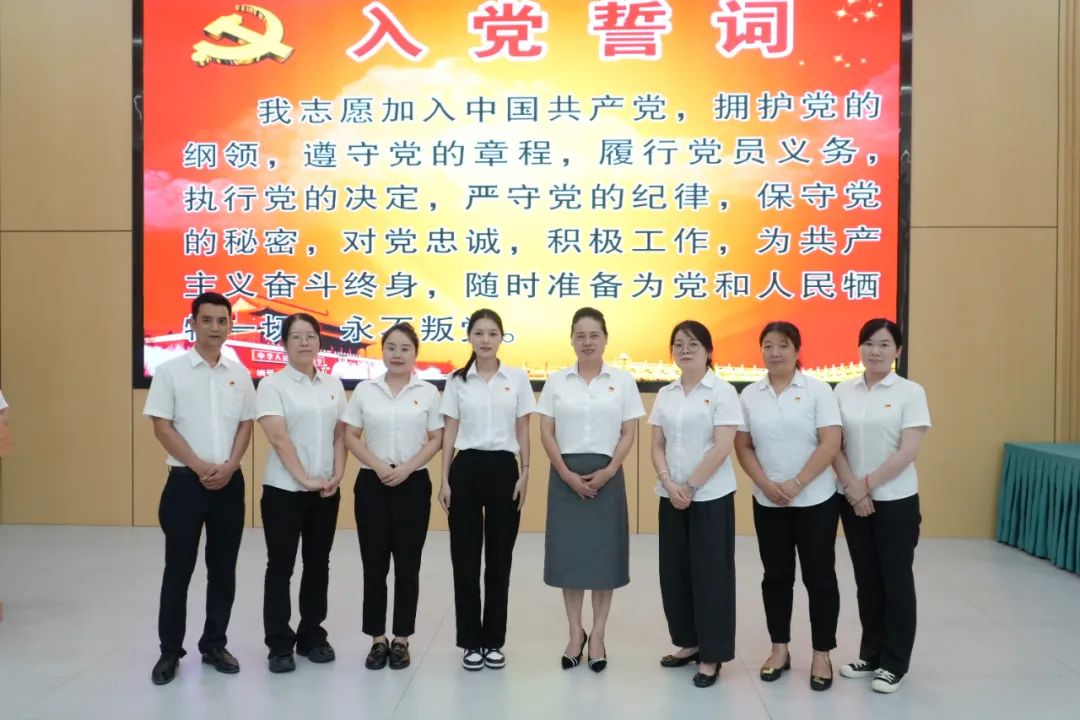 在莊嚴(yán)的儀式中,黨委組織委員李勁湘同志宣布了按期轉(zhuǎn)為預(yù)備黨員的9位同志名單,陳毳萍書記親自為到場的7名預(yù)備黨員佩戴上閃亮的黨徽。隨后,在陳書記的領(lǐng)誓下,全體與會黨員面向黨旗,高舉右拳,重溫了鏗鏘有力的入黨誓詞。錚錚誓言回蕩會場,表達(dá)了為黨的事業(yè)奮斗終身的堅定決心。